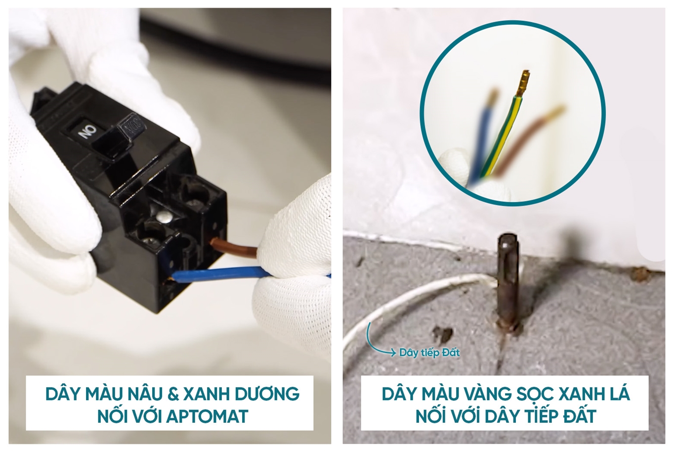 Dây Vàng – Xanh Lá Sọc Vàng nối chắc chắn vào hệ thống tiếp đất hoặc cọc tiếp địa riêng.