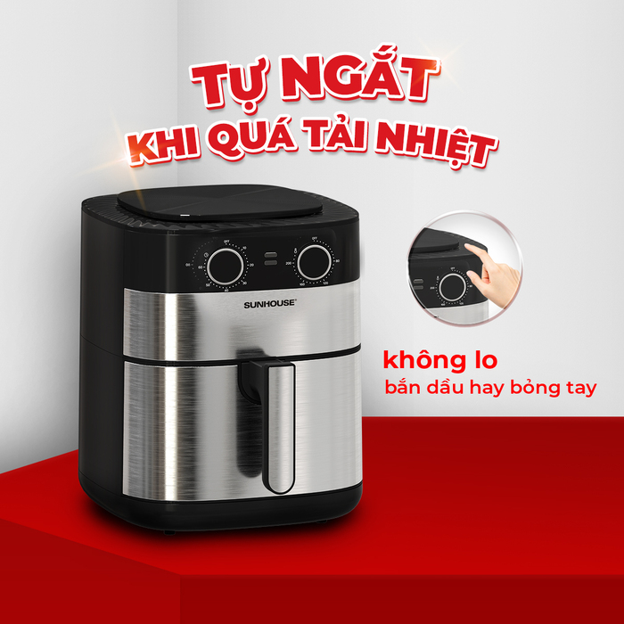 Ngoài ra, tính năng ngắt điện khi quá tải nhiệt còn giúp hạn chế tình trạng làm cháy thực phẩm, giúp gia tăng tuổi thọ của nồi chiên không dầu và phòng chống cháy nổ.