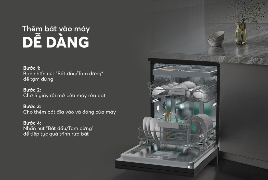 Nếu trong lúc máy đang hoạt động mà bạn muốn thêm bát đĩa vào thì cần làm những bước nào? Lưu ý, bạn chỉ có thể thêm bát đĩa khi ngăn chứa viên rửa chưa được mở ra ta làm như sau: