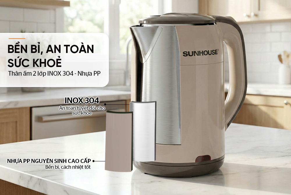 • Thân ấm 2 lớp: INOX 304 an toàn - Nhựa PP bền bỉ