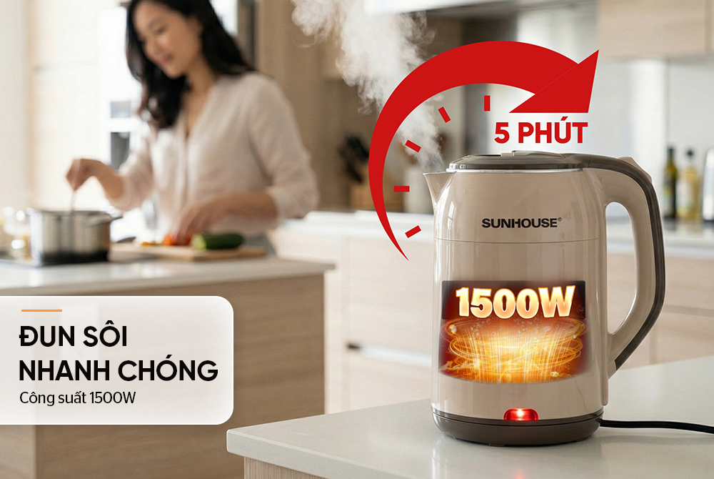• Công suất 1500W đun sôi nhanh chóng chỉ vài phút