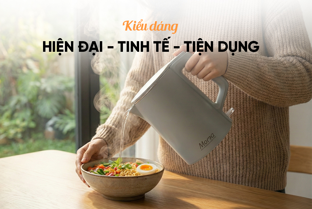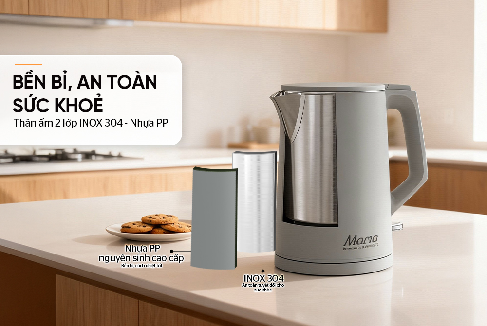 • Thân ấm 2 lớp: Inox 304 chuẩn an toàn sức khỏe, Nhựa PP bền bỉ