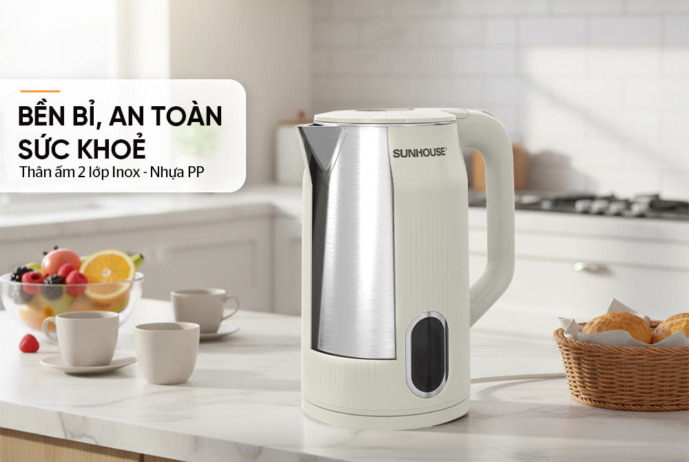 Với tone trắng sữa thanh lịch, Ấm siêu tốc inox 2 lớp 3L Sunhouse SHD1365 mang đến vẻ đẹp hiện đại và sang trọng cho gian bếp.