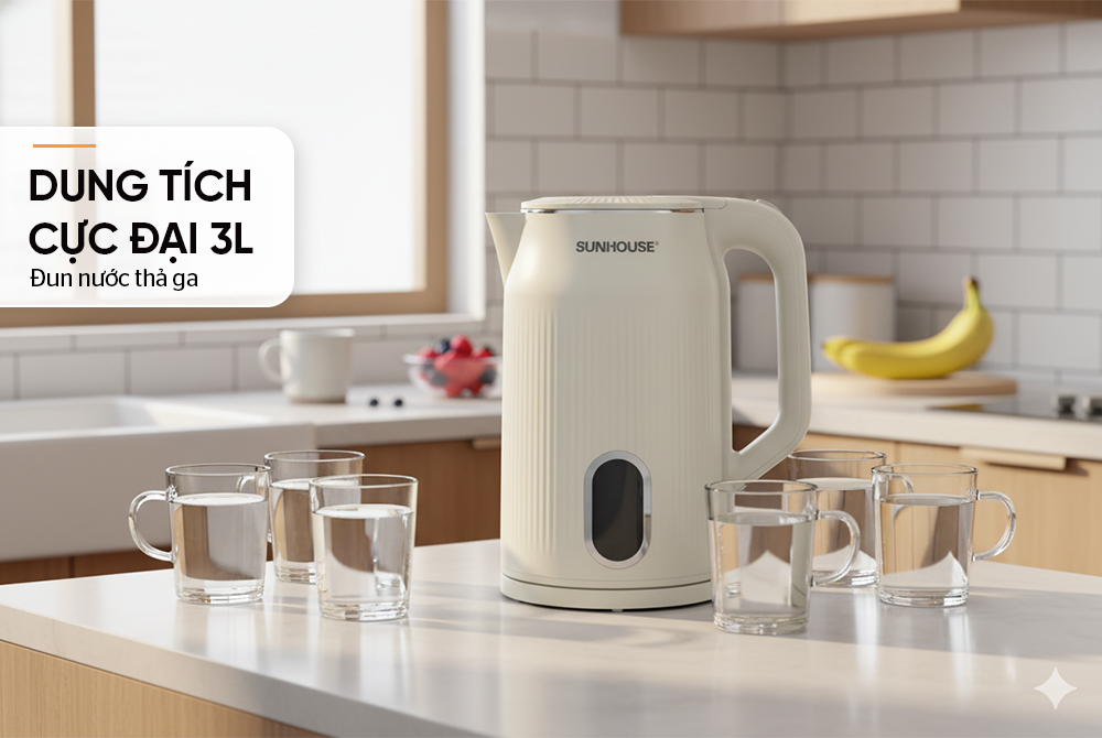 Ấm siêu tốc là trợ thủ đắc lực giúp bạn chuẩn bị nước nóng nhanh chóng, tiết kiệm thời gian cho mọi nhu cầu hằng ngày. Ấm siêu tốc inox 2 lớp 3L Sunhouse SHD1365 sở hữu thiết kế hiện đại, gam màu trang nhã, phù hợp cho mọi không gian từ gia đình đến văn phòng. Thân ấm 2 lớp cách nhiệt Inox 304 - nhựa PP giúp giữ nhiệt tốt, chống bỏng hiệu quả, kết hợp đế xoay 360° linh hoạt và dung tích 3L cực đại, mang đến sự tiện lợi tối đa khi sử dụng.