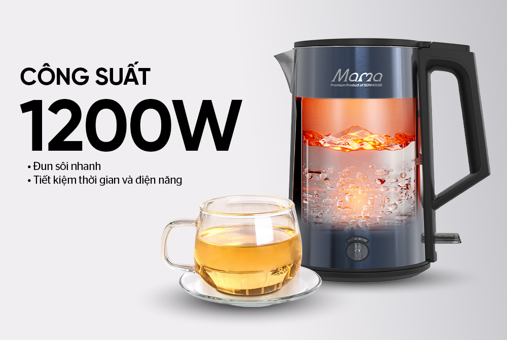 Với công suất 1200W, Ấm siêu tốc inox 3 lớp 1L Sunhouse Mama SHD1373 có thể đun sôi đầy bình chỉ trong khoảng vài phút, vừa tiết kiệm điện, vừa đáp ứng nhanh nhu cầu sử dụng hằng ngày như pha trà, cà phê hay nấu mì.