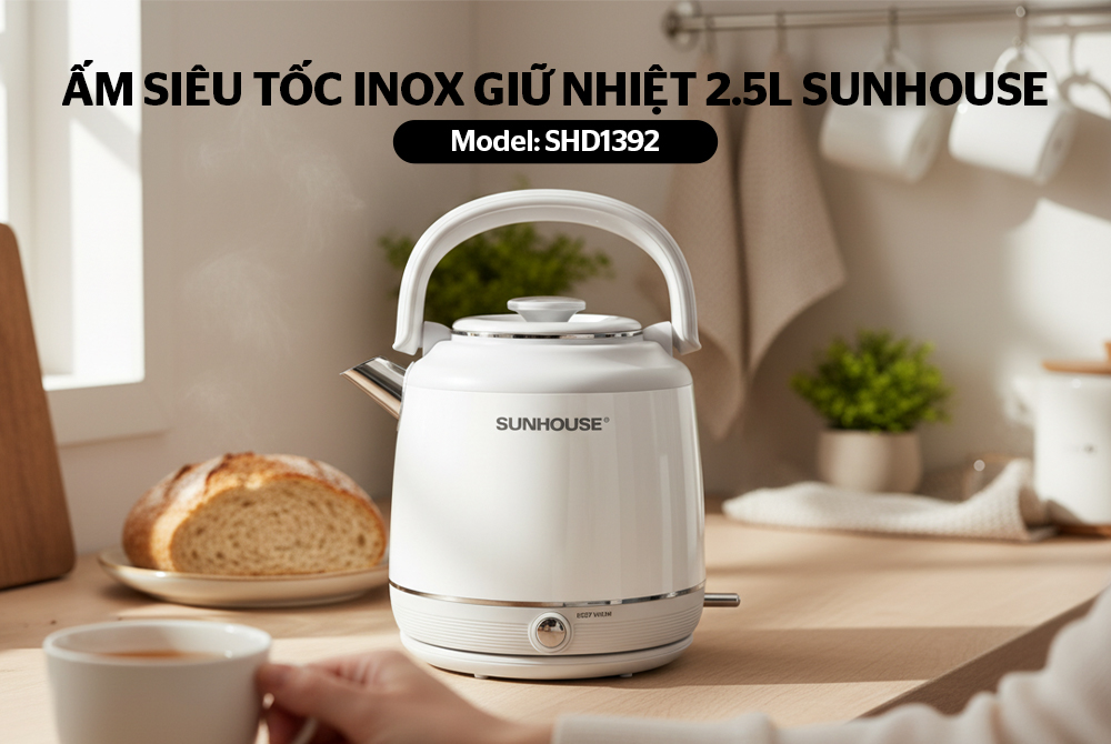 Ấm siêu tốc Inox giữ nhiệt 2.5L Sunhouse SHD1392 sở hữu thiết kế hiện đại, tối giản nhưng tinh tế, dễ dàng phù hợp với nhiều không gian bếp khác nhau. Tay cầm chắc chắn, vòi rót tiện lợi và nút điều khiển dễ thao tác giúp người dùng sử dụng thoải mái mỗi ngày, biến sản phẩm trở thành giải pháp đun nước nóng bền bỉ, an toàn và tiện lợi cho gia đình Việt.
