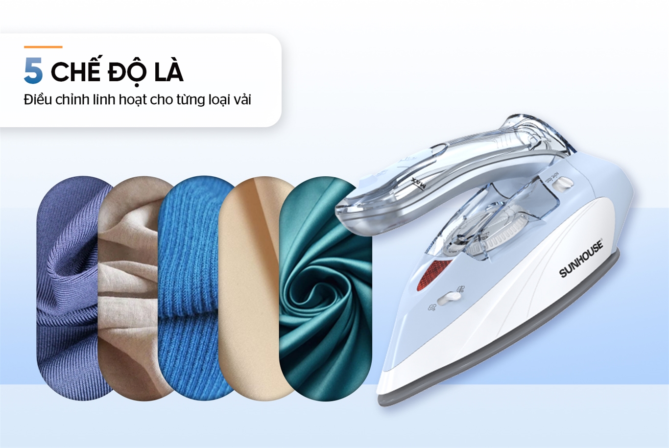 Bàn là hơi cầm tay SUNHOUSE SHD2171 được trang bị 5 chế độ là riêng biệt, tương thích với các chất liệu vải phổ biến như lụa, cotton, len, nylon và lanh. Người dùng có thể dễ dàng lựa chọn chế độ phù hợp, giúp làm phẳng hiệu quả mà vẫn bảo vệ sợi vải, giữ trang phục luôn bền đẹp.