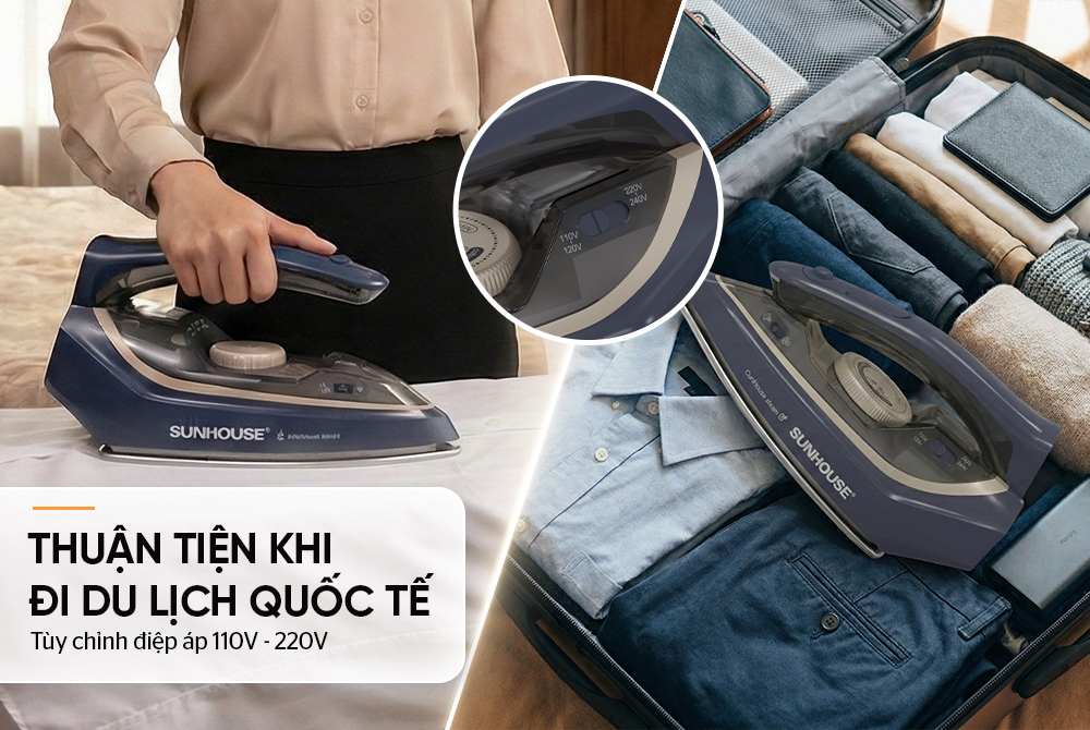 Sự khác biệt về điện áp giữa các quốc gia đôi khi gây bất tiện cho người dùng khi mang theo thiết bị điện. Với khả năng tùy chỉnh điện áp 110V - 220V, bàn là hơi cầm tay SUNHOUSE SHD2172 cho phép sử dụng linh hoạt tại nhiều quốc gia, giúp bạn luôn yên tâm giữ trang phục phẳng phiu trong suốt chuyến đi.