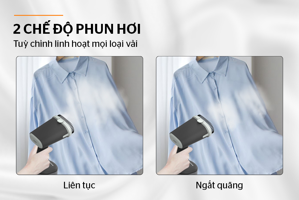 • 2 chế độ phun hơi: Liên tục - Ngắt quãng, tùy chỉnh linh hoạt mọi loại vải