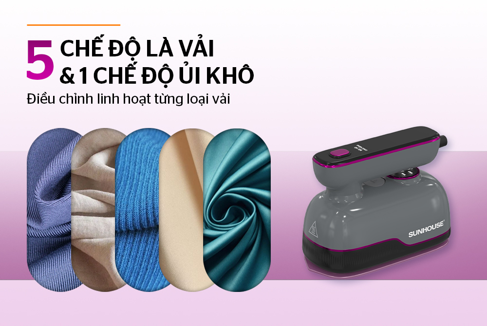 Bàn là hơi cầm tay Sunhouse SHD2174Gđược trang bị 5 chế độ là vải và 1 chế độ ủi khô, cho phép người dùng lựa chọn mức phù hợp với từng chất liệu vải. Việc điều chỉnh linh hoạt giúp bảo vệ sợi vải, hạn chế cháy xém và hư hỏng quần áo. Nhờ đó, trang phục luôn giữ được form dáng và độ bền sau nhiều lần sử dụng. Sản phẩm phù hợp cho nhiều loại quần áo trong gia đình, từ vải mỏng đến vải dày.