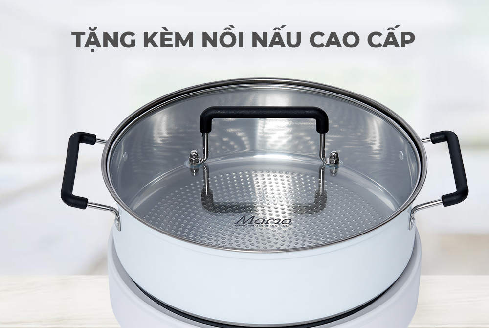 Tặng kèm bếp là một nồi lẩu inox có vung kính trong suốt tiện lợi. Quai cầm và nắp vung đều được bọc nhựa cách nhiệt an toàn, hạn chế bỏng tay, vô cùng tiện lợi cho gia đình quây quần dịp lễ lạt, cuối tuần…