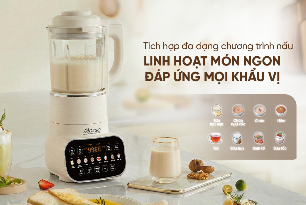 Máy được cài đặt sẵn 8 chức năng nấu đa dạng như sữa hạt, cháo ngũ cốc, sinh tố, sữa lắc… giúp người dùng dễ dàng thay đổi thực đơn mỗi ngày, phù hợp với nhiều khẩu vị khác nhau trong gia đình.