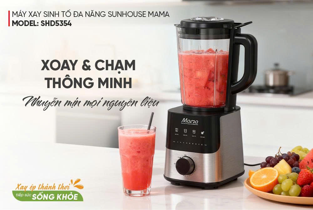 Máy xay sinh tố đa năng SUNHOUSE MAMA SHD5354 là trợ thủ tiện lợi cho gian bếp hiện đại, đáp ứng linh hoạt nhiều nhu cầu chế biến hằng ngày. Sản phẩm nổi bật với thiết kế điều khiển 2 trong 1 - kết hợp điều khiển cảm ứng hiện đại và núm vặn truyền thống, cùng nhiều chế độ xay đa dạng, phù hợp từ các món sinh tố, sữa lắc đến xay đá hay xay nhồi nguyên liệu.