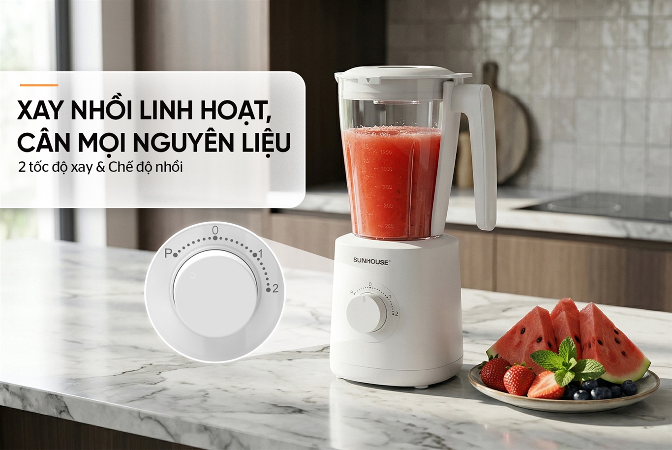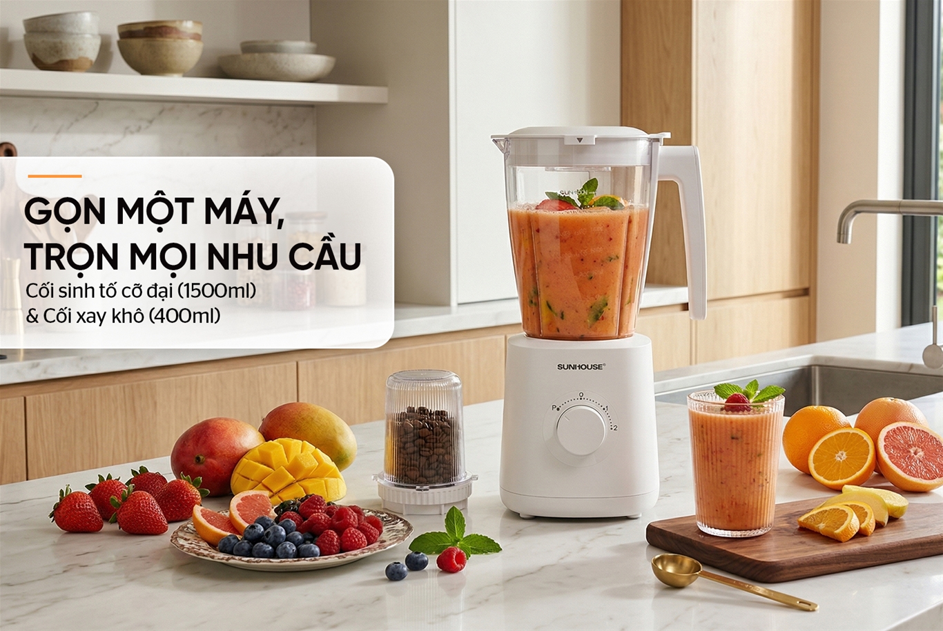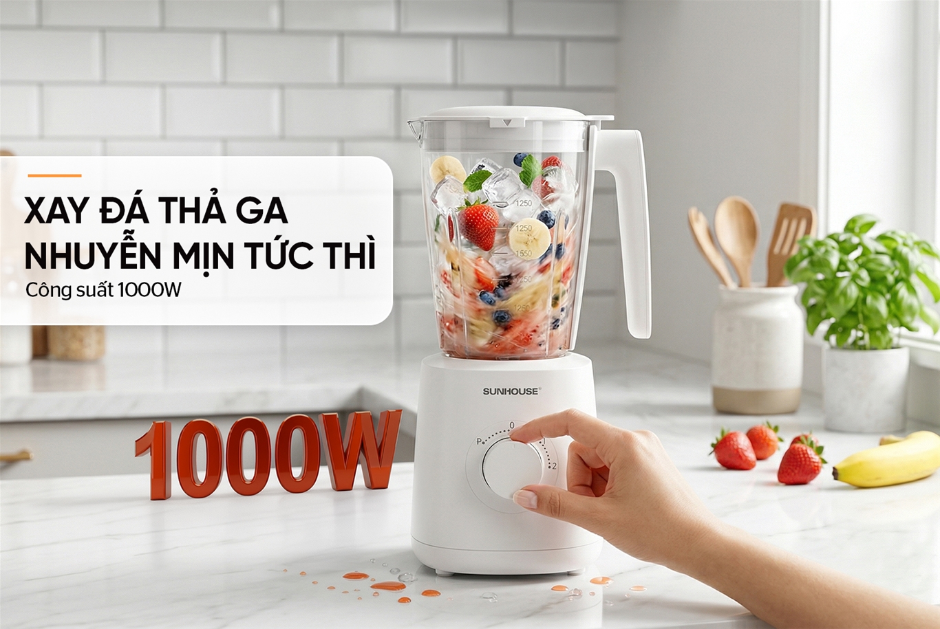 • Công suất 1000W xay khỏe & nhanh, nhuyễn mịn mọi nguyên liệu