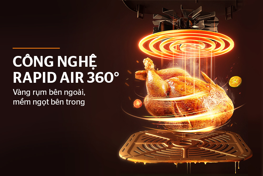 Ứng dụng công nghệ Rapid Air nhiệt đối lưu 360°, luồng khí nóng lưu chuyển đều quanh thực phẩm giúp món ăn giòn bên ngoài, mềm bên trong mà không cần dùng nhiều dầu. Công nghệ này giúp giảm đến 80% chất béo, hỗ trợ chế độ ăn lành mạnh hơn mà vẫn đảm bảo hương vị hấp dẫn.