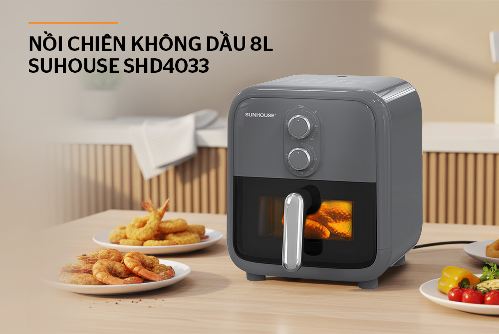 Nồi chiên không dầu Sunhouse mang đến giải pháp nấu ăn nhanh gọn, an toàn và tốt cho sức khỏe với khả năng giảm dầu mỡ đáng kể. nồi chiên không dầu 8L Sunhouse SHD4033 sở hữu dung tích lớn, công nghệ làm nóng hiện đại cùng loạt tính năng tiện lợi, phục vụ đa dạng món chiên, nướng, quay cho cả gia đình. Thiết kế hiện đại, dễ sử dụng và tiết kiệm thời gian, phù hợp với mọi căn bếp Việt.