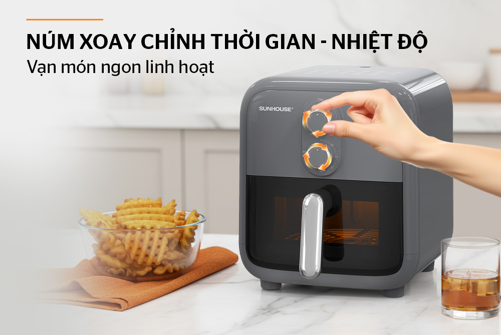 Hệ thống 2 núm xoay cơ cho phép người dùng dễ dàng tùy chỉnh mức nhiệt và thời gian theo từng món ăn: chiên, nướng, quay, hâm nóng… Giao diện trực quan giúp thao tác nhanh, phù hợp với nhiều đối tượng sử dụng.