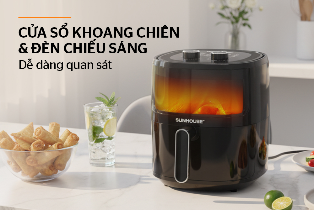 Nồi chiên không dầu 5L Sunhouse SHD4021 được trang bị cửa sổ kính kết hợp đèn chiếu sáng bên trong, cho phép quan sát toàn bộ quá trình nấu mà không cần mở nắp. Điều này giúp giữ nhiệt ổn định, món ăn chín đều và hạn chế thất thoát hơi nóng.