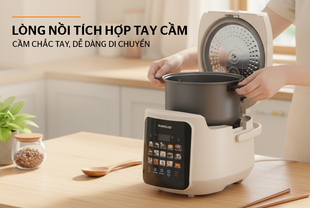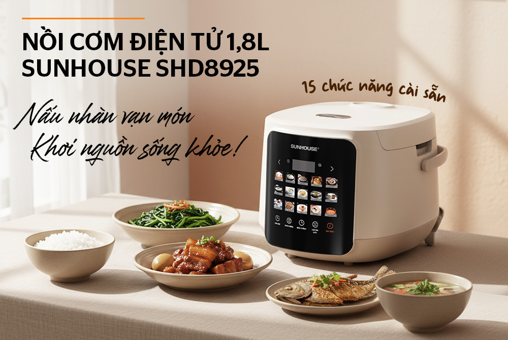 Nồi cơm điện tử 1.8L Sunhouse SHD8925 là lựa chọn thông minh cho bữa cơm chuẩn vị mỗi ngày, với 15 chế độ nấu tự động giúp bạn dễ dàng sáng tạo hàng chục món ngon chỉ với một chạm. Lòng nồi chống dính Teflon (USA) bền bỉ, an toàn cho sức khỏe và dễ vệ sinh. Tích hợp chế độ nấu nhanh, hẹn giờ 24h cùng quai xách tiện lợi, sản phẩm mang đến trải nghiệm nấu ăn hiện đại và tiện dụng cho mọi gia đình.