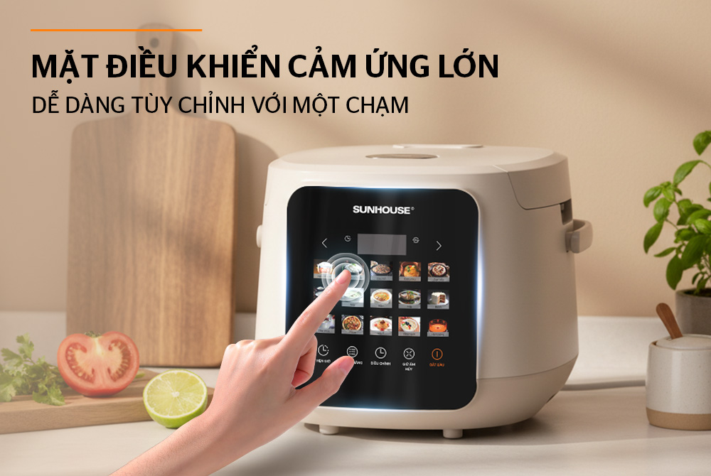 Nồi cơm điện tử 1.8L Sunhouse SHD8925 được thiết kế với phong cách hiện đại, tinh gọn và sang trọng. Tông màu nhã nhặn tạo cảm giác thanh lịch, dễ dàng hòa hợp với mọi không gian bếp. Mặt trước nổi bật với bảng điều khiển cảm ứng lớn, hiển thị hình ảnh món ăn trực quan, giúp người dùng thao tác dễ dàng và nhanh chóng.