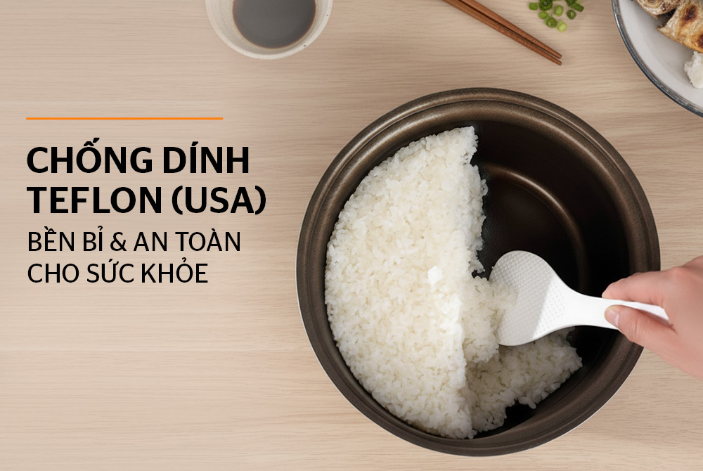 Nồi cơm điện tử 1.8L Sunhouse SHD8925 sử dụng lòng nồi phủ chống dính Teflon (USA) – thương hiệu chống dính uy tín hàng đầu thế giới, được phát triển bởi tập đoàn Chemours (Mỹ). Lớp phủ Teflon nổi tiếng với khả năng chống bám dính vượt trội, giúp hạt cơm tơi xốp, không cháy khét và dễ dàng vệ sinh sau khi nấu.