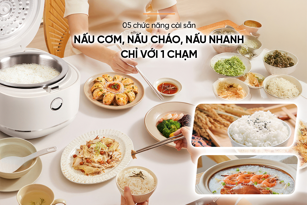 • Đa chức năng nấu: Nấu cơm, nấu cháo, nấu canh, nấu nhanh, hâm nóng