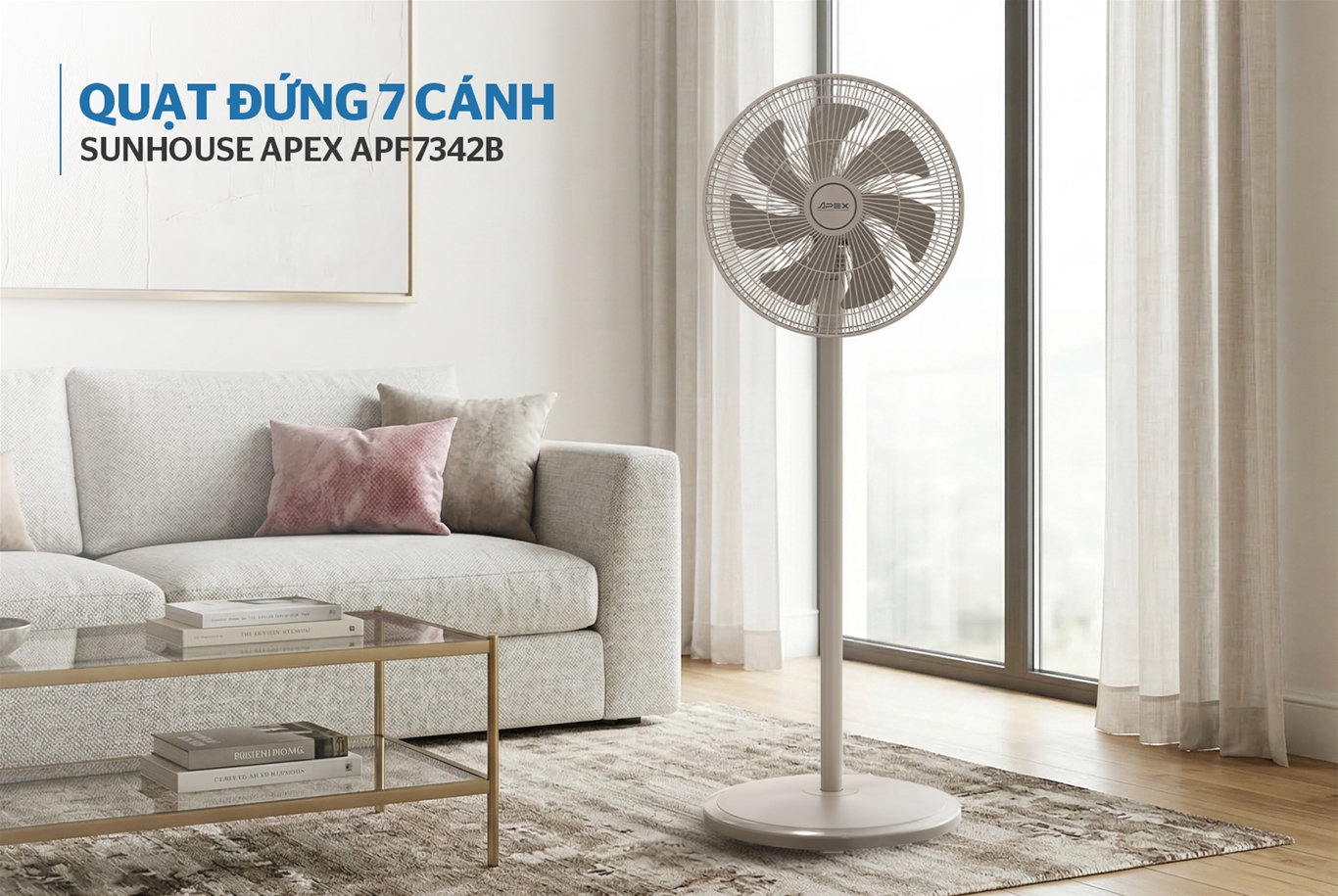 Quạt đứng 7 cánh SUNHOUSE APEX APF7342B mang đến không gian sống mát lành và dễ chịu với luồng gió mạnh mẽ, vận hành êm ái và đặc biệt tiết kiệm điện năng nhờ động cơ BLDC Inverter hiện đại. Sản phẩm chính là giải pháp làm mát tối ưu cho gia đình trong những ngày nắng nóng.