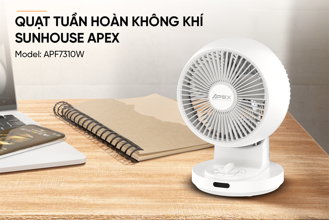 Quạt tuần hoàn không khíSunhouse Apex APF7310W sở hữu thiết kế màu trắng tinh tế, dễ dàng phối hợp với mọi phong cách nội thất. Nhờ kích thước nhỏ gọn, quạt có thể linh hoạt đặt trên bàn làm việc, kệ tủ hoặc để dưới sàn mà không chiếm nhiều diện tích.