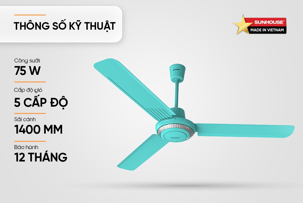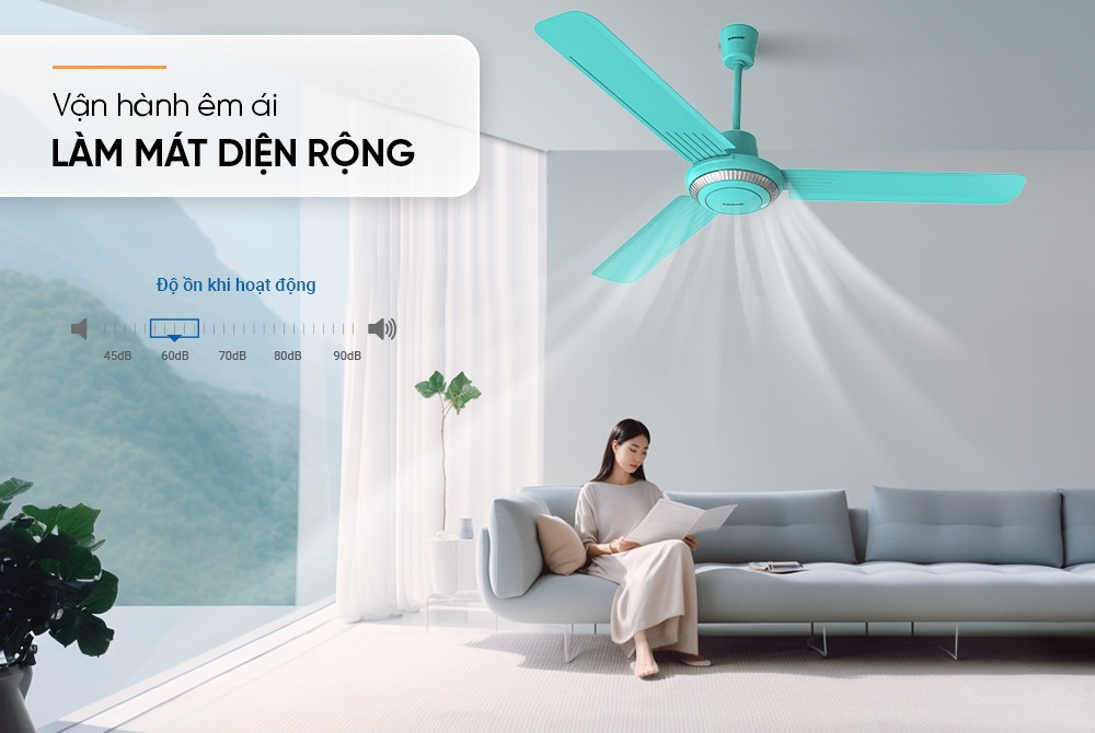 Quạt trần 3 cánh SUNHOUSE SHD7659GR vận hành êm ái với độ ồn không quá 65dB, đảm bảo không gian yên tĩnh ngay cả khi hoạt động ở tốc độ cao. Công suất 75W kết hợp sải cánh rộng 1.4m tạo luồng gió mạnh mẽ, lan tỏa mát mẻ khắp không gian, mang lại cảm giác sảng khoái và thoải mái tức thì cho cả gia đình.