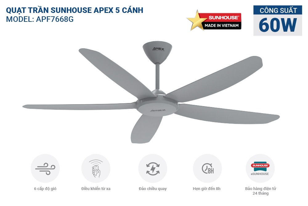 QUẠT TRẦN 5 CÁNH SUNHOUSE APEX APF7668G