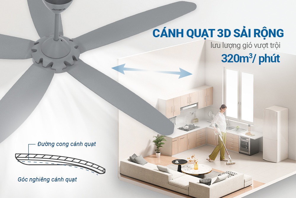 • Cánh quạt 3D, sải cánh rộng, lưu lượng gió vượt trội