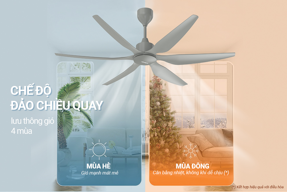 Tính năng đảo chiều còn giúp luồng gió lưu thông đều đặn trong phòng, tránh hiện tượng gió tập trung tại một điểm gây khó chịu. Đây là lựa chọn hoàn hảo cho các gia đình, đặc biệt phù hợp với trẻ nhỏ và người lớn tuổi, giúp tiết kiệm điện năng mà vẫn đảm bảo không gian sống thoải mái quanh năm.