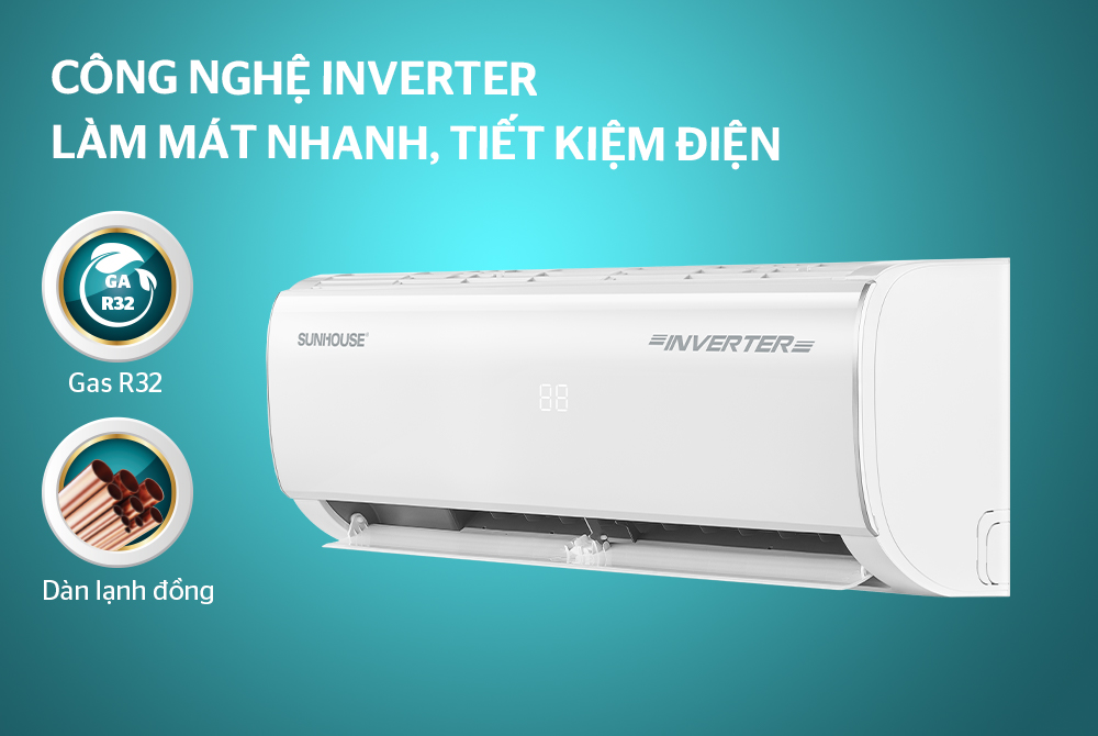 Điều hòa Inverter SUNHOUSE sử dụng dàn lạnh ống đồng và môi chất lạnh gas R32. Môi chất lạnh R32 là môi chất lạnh tiên tiến nhất hiện nay với hơi lạnh sâu, làm lạnh nhanh chóng. Kết hợp cùng dàn lạnh ống đồng có khả năng giữ nhiệt tốt, giảm rò rỉ môi chất lạnh, điều hòa Inverter SUNHOUSE giúp người dùng nhanh chóng tận hưởng hơi lạnh êm ái, dễ chịu.