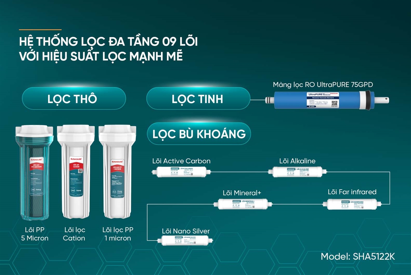 Với định vị “chuẩn tinh khiết, uống tại vòi”, máy lọc nước RO 09 lõi SUNHOUSE SHA5122K được trang bị bộ 09 lõi đa tầng bao gồm: cấp lọc thô, cấp lọc tinh và cấp lọc bù khoáng: