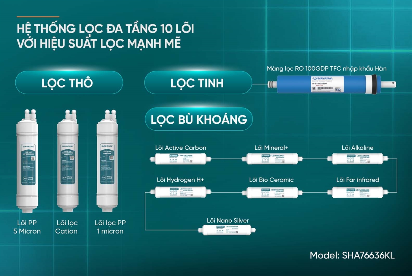 Lõi Nano Silver: Diệt khuẩn, khử mùi, cân bằng pH, bổ sung khoáng chất và tạo vị ngọt tự nhiên cho nước.
