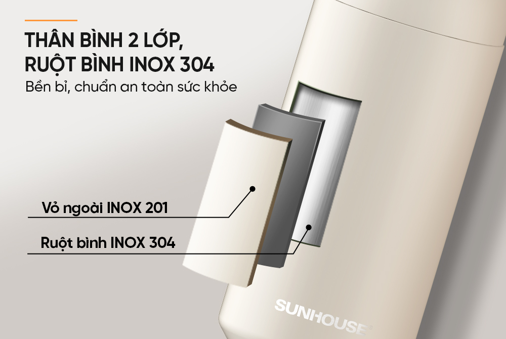Thân bình 2 lớp - Ruột INOX 304 cao cấp Bình giữ nhiệt Easy Go 350ml SUNHOUSE KS-TU350EW được cấu tạo thân 2 lớp cách nhiệt hiệu quả, giữ nhiệt độ ổn định suốt nhiều giờ. Ruột bình làm từ INOX 304 an toàn, không gỉ, không thôi nhiễm chất độc hại, đảm bảo an toàn cho sức khỏe người dùng.