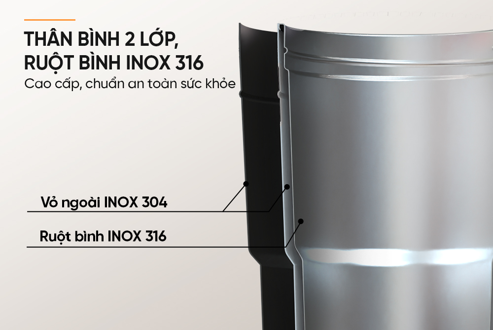 • Lòng bình INOX 316 cao cấp, an toàn tuyệt đối cho sức khỏe người dùng