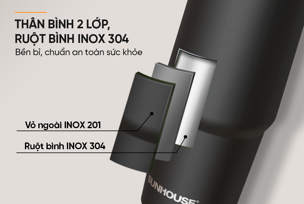 Thân bình 2 lớp cách nhiệt, ruột bình INOX 304 an toàn sức khỏe Bình giữ nhiệt City Drive 900ml Sunhouse KS-TU900CB được cấu tạo bởi 2 lớp INOX cao cấp, lớp ngoài bền bỉ chống móp méo, chống trầy xước, lớp trong giữ nhiệt hiệu quả và bảo vệ hương vị đồ uống. Lòng bình làm từ INOX 304 an toàn, không thôi nhiễm, không chứa chất độc hại, đảm bảo giữ nguyên chất lượng và hương vị đồ uống nóng - lạnh. Đây là lựa chọn lý tưởng cho người dùng quan tâm sức khỏe và độ bền sản phẩm.