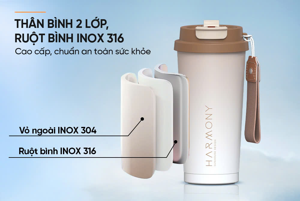 Lõi bình làm từ INOX 316 cao cấp, bền chắc và an toàn cho sức khỏe, không phản ứng với đồ uống nóng lạnh. Thân bình 2 lớp giúp duy trì nhiệt độ ổn định lâu hơn.