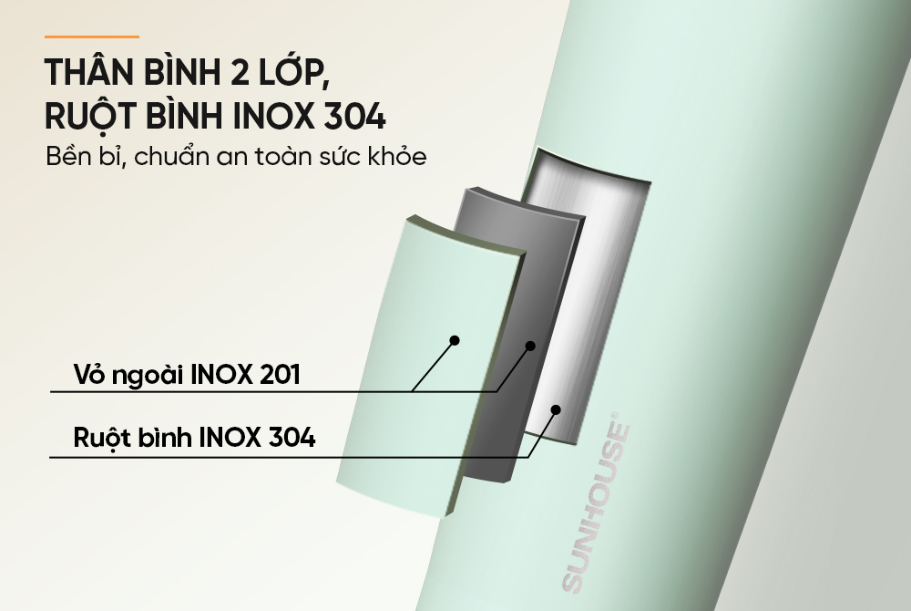 Thân bình 2 lớp - Ruột bình INOX 304 an toàn sức khỏe Bình ly giữ nhiệt Lightly 650ml Sunhouse KS-TU650LG sở hữu cấu tạo 2 lớp chắc chắn với ruột bình INOX 304 cao cấp, đảm bảo an toàn cho sức khỏe người dùng, không thôi nhiễm chất độc hại khi đựng nước nóng hay lạnh.