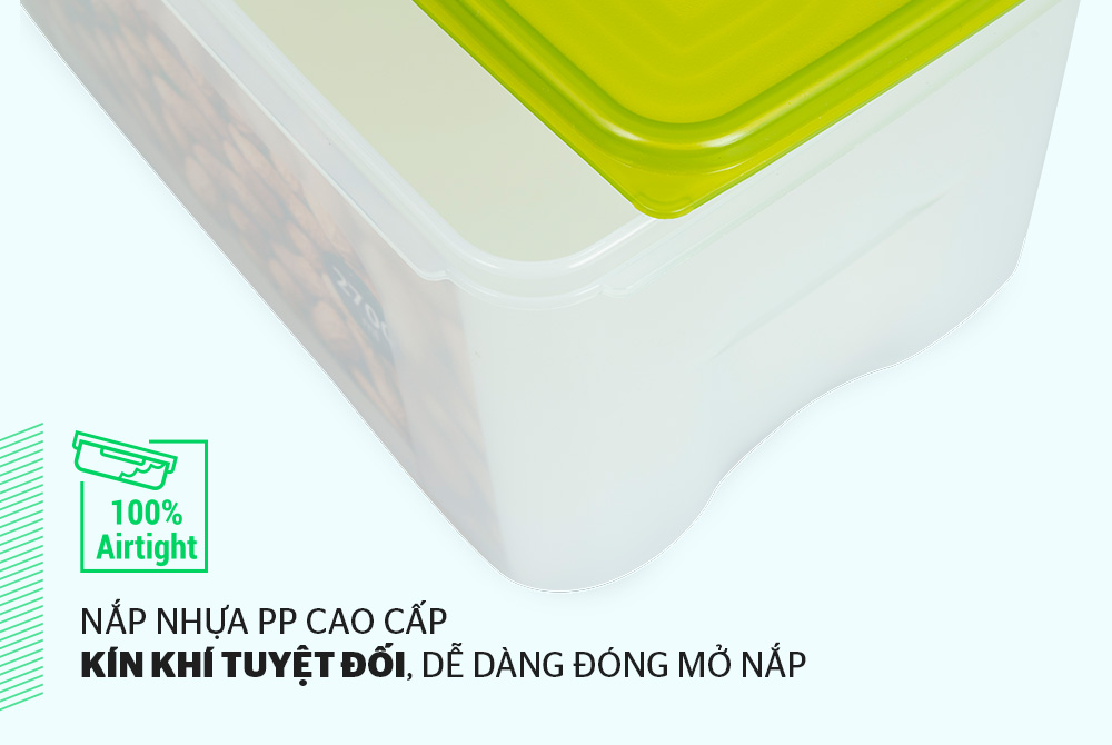Nắp nhựa LDPE cao cấp Nắp nhựa dẻo với độ co phù hợp, kín khít miệng hộp nên dù không có gioăng silicon thì vẫn kín khí tuyệt đối. Điều này vô cùng quan trọng trong việc bảo quản thực phẩm khô, các loại hạt…