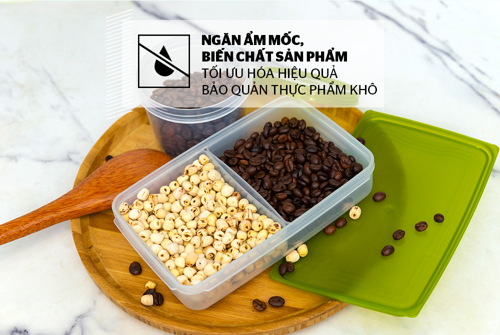 Chia ngăn tiện lợi Sản phẩm được chia làm hai ngăn riêng biệt, là các khay từ nhựa PP có thể tháo rời. Bạn có thể trữ riêng 1 loại thực phẩm hoặc chia 2 loại đồ khô vào cùng một hộp để tiết kiệm diện tích mà không sợ bị trộn lẫn. Khi cần lấy loại thực phẩm nào thì chỉ cần nhấc khay nhựa ra.