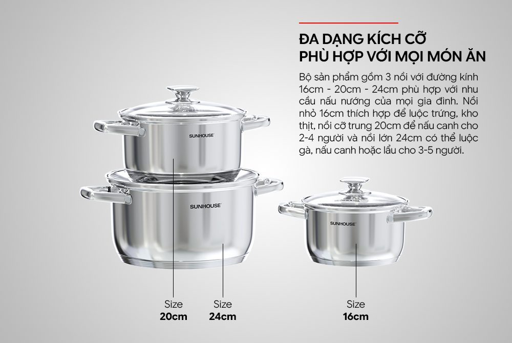 Bộ sản phẩm gồm 3 nồi với đường kính 16cm - 20cm - 24cm phù hợp với nhu cầu nấu nướng của mọi gia đình. Nồi nhỏ 16cm thích hợp để luộc trứng, kho thịt, nồi cỡ trung 20cm để nấu canh cho 2-4 người và nồi lớn 24cm có thể luộc gà, nấu canh hoặc lẩu cho 3-5 người.