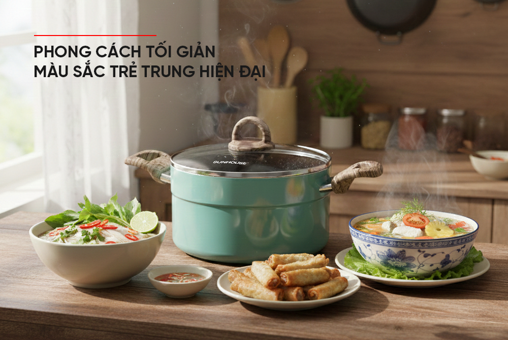 Thiết kế tinh gọn với gam màu xanh trang nhã, trẻ trung, bộ nồi mang lại vẻ đẹp hiện đại, hài hòa với nhiều phong cách bếp khác nhau. Không chỉ là dụng cụ nấu nướng, sản phẩm còn góp phần làm nổi bật sự tinh tế trong không gian sống.