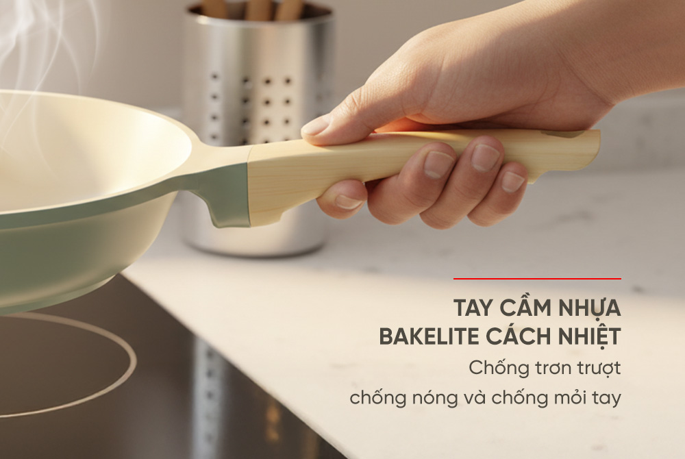 Tay cầm được làm từ nhựa Bakelite cao cấp, có khả năng cách nhiệt tối ưu, không bị nóng khi chạm vào. Thiết kế chống trơn trượt, ôm vừa tay, hạn chế mỏi khi cầm nắm lâu, mang lại cảm giác thoải mái và an toàn tuyệt đối trong suốt quá trình nấu nướng.