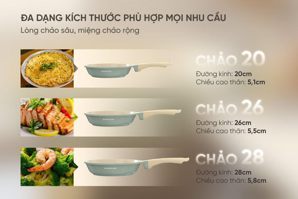 Chảo có nhiều phiên bản kích thước khác nhau (20cm - 26cm - 28cm), từ nhỏ gọn cho các món chiên xào đơn giản đến lớn hơn để nấu nướng cho cả gia đình. Lòng chảo sâu, miệng rộng giúp thao tác đảo, trộn nguyên liệu dễ dàng hơn, hạn chế văng dầu mỡ và giữ trọn hương vị món ăn.
