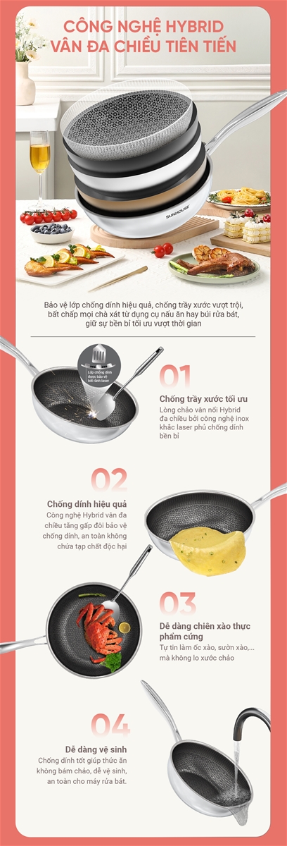• Công nghệ Hybrid vân đa chiều tiên tiến – Chống trầy xước, bảo vệ lớp chống dính hiệu quả