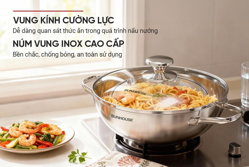 Đặc biệt, để tối ưu hiệu quả chống dính tự nhiên và giúp các món chiên xào ngon chuẩn vị, bạn có thể tham khảo cách “tôi chảo” đơn giản với Chảo xào inox liền khối SUNHOUSE Healthy. Thao tác đúng cách ngay từ lần sử dụng đầu tiên sẽ giúp hình thành lớp chống dính tự nhiên, hạn chế bám dính thực phẩm và nâng cao độ bền cho sản phẩm.