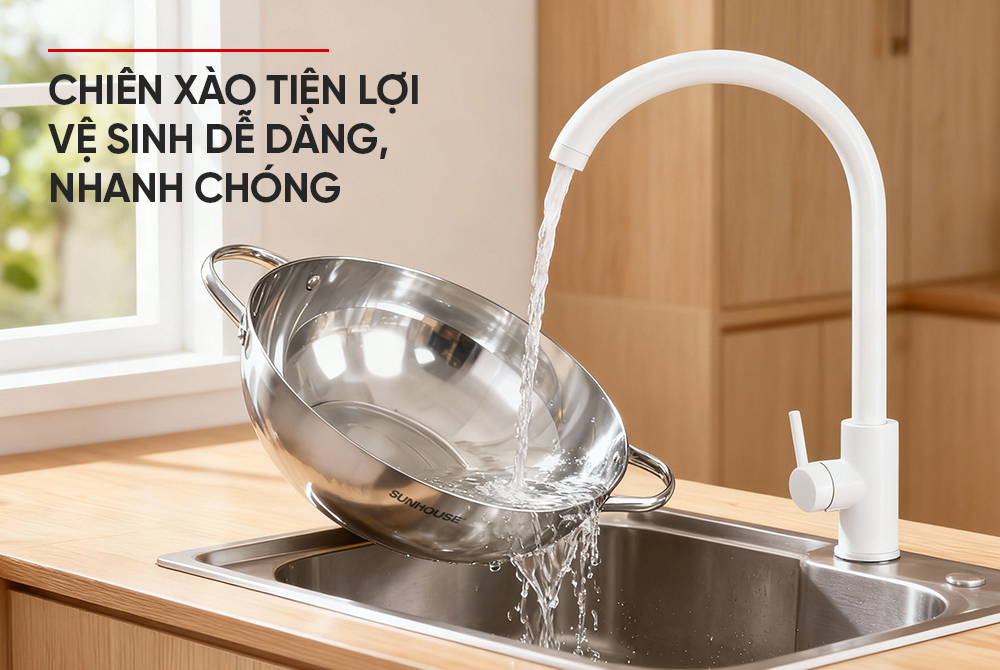 Đặc biệt, để tối ưu hiệu quả chống dính tự nhiên và giúp các món chiên xào ngon chuẩn vị, bạn có thể tham khảo cách “tôi chảo” đơn giản với Chảo xào inox liền khối SUNHOUSE Healthy. Thao tác đúng cách ngay từ lần sử dụng đầu tiên sẽ giúp hình thành lớp chống dính tự nhiên, hạn chế bám dính thực phẩm và nâng cao độ bền cho sản phẩm.