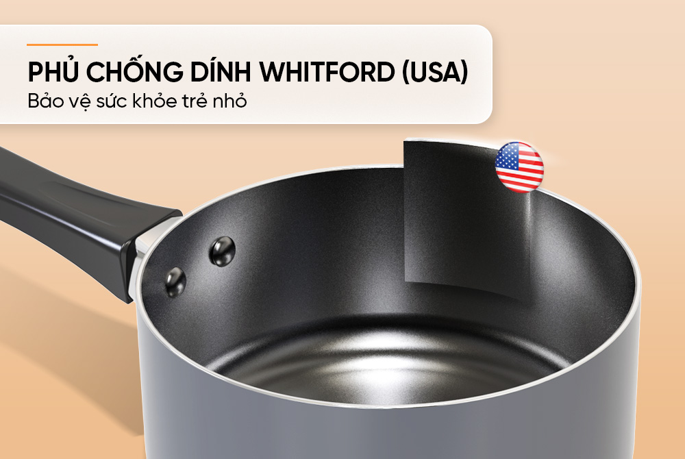 Nồi được phủ lớp chống dính Whitford (USA) cao cấp, an toàn cho sức khỏe, không chứa PTFEs và BPA, đảm bảo an toàn cho trẻ nhỏ. Lớp chống dính này có khả năng chống dính tốt, giúp bạn dễ dàng nấu nướng và vệ sinh sau khi sử dụng.